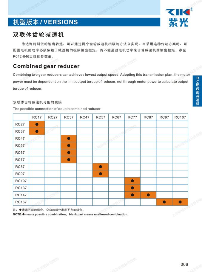 為達到特別低的輸出轉(zhuǎn)速,可以通過兩個齒輪減速機相聯(lián)的方法來實現(xiàn)。當采用這種傳動方案時,可配置電機的功率必須依賴于減速機的極限輸出扭矩,而不能通過電機功率來計算減速機的輸出扭矩。參見下面性能參數(shù)表:RC17 RC27 RC37 RC47 RC57 RC67 RC77 RC87 RC97 RC107